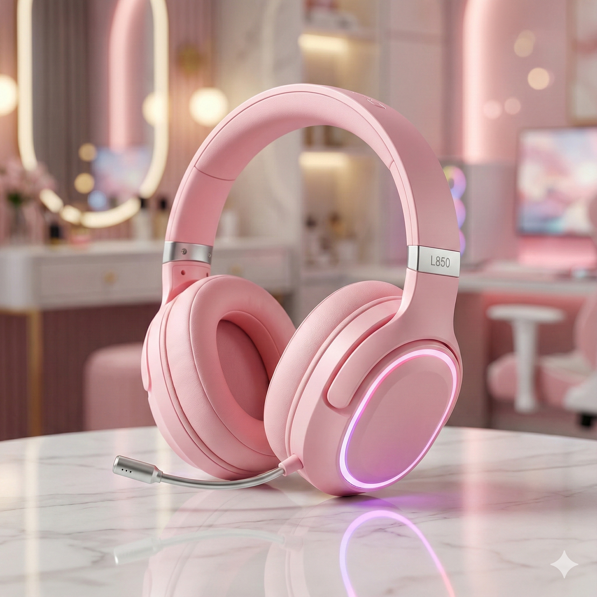 ¡Combina el estilo más kawaii con el rendimiento gamer! Te presentamos los Audífonos Inalámbricos L850, un diseño espectacular que fusiona un acabado en color rosa pastel con una iluminación RGB dinámica en los auriculares, convirtiéndolos en la pieza central de tu setup de streaming o gaming.