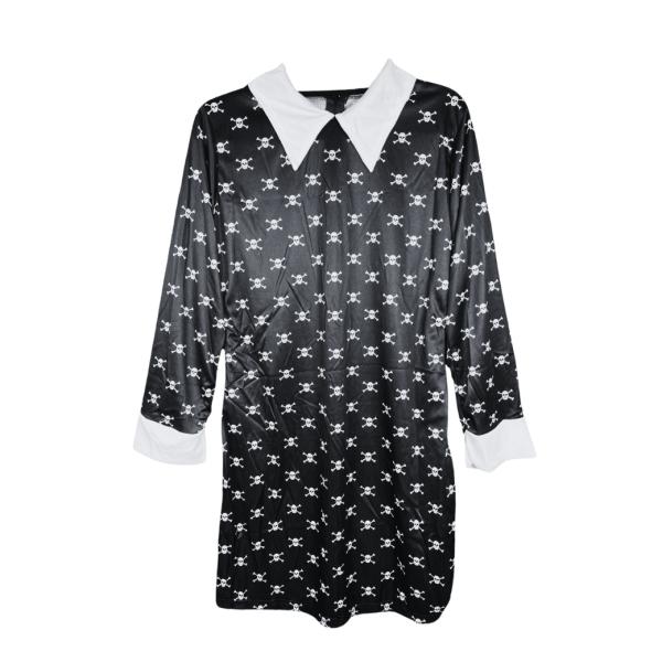 El Clásico Vestido: Un vestido negro de manga larga con un patrón sutil de calaveras o telarañas (según el patrón del vestido en la imagen) para ese toque especial.