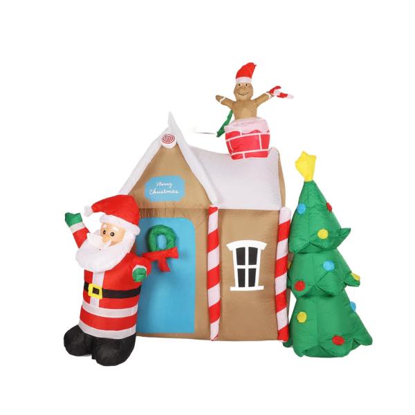 Escena de Fantasía: El inflable muestra a Santa Claus listo para entrar en una dulce Casa de Jengibre, acompañado de un Árbol de Navidad y un divertido Muñeco de Jengibre en el tejado.