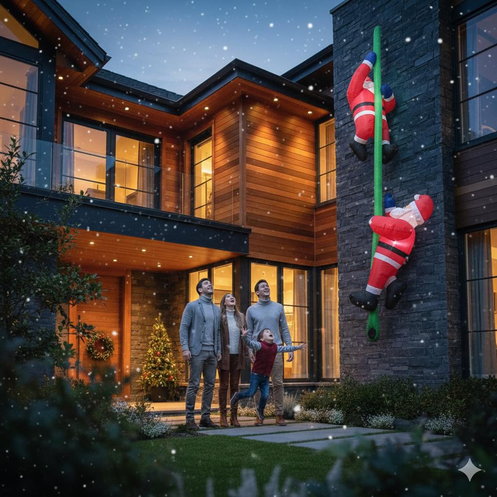 Acción y Movimiento: Muestra a múltiples Santas escalando una escalera o cuerda verde, creando una escena dinámica que captura la mirada.