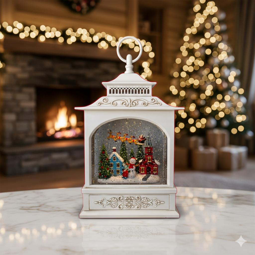 Esta exquisita Lámpara Navideña de Muñeco de Nieve (en un elegante diseño de farol blanco) es una pieza decorativa que evoca la nostalgia de una Nochebuena nevada. Su acabado en blanco y su escena interior la hacen perfecta para un estilo navideño sofisticado.